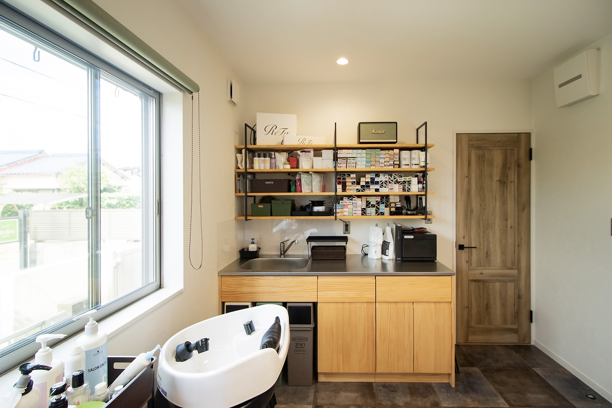 美容室の一角に、作業台として無垢の木のキッチンsu:ijiを採用されました。
