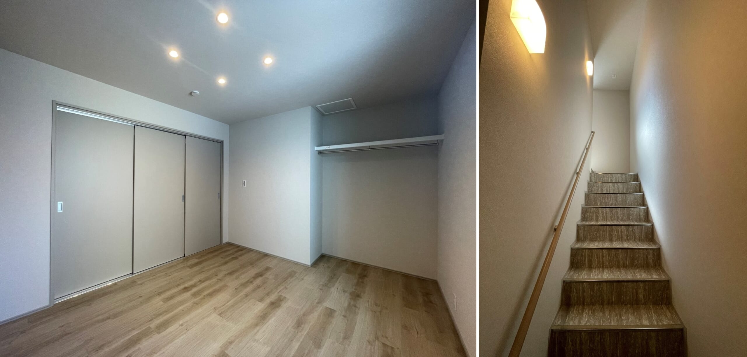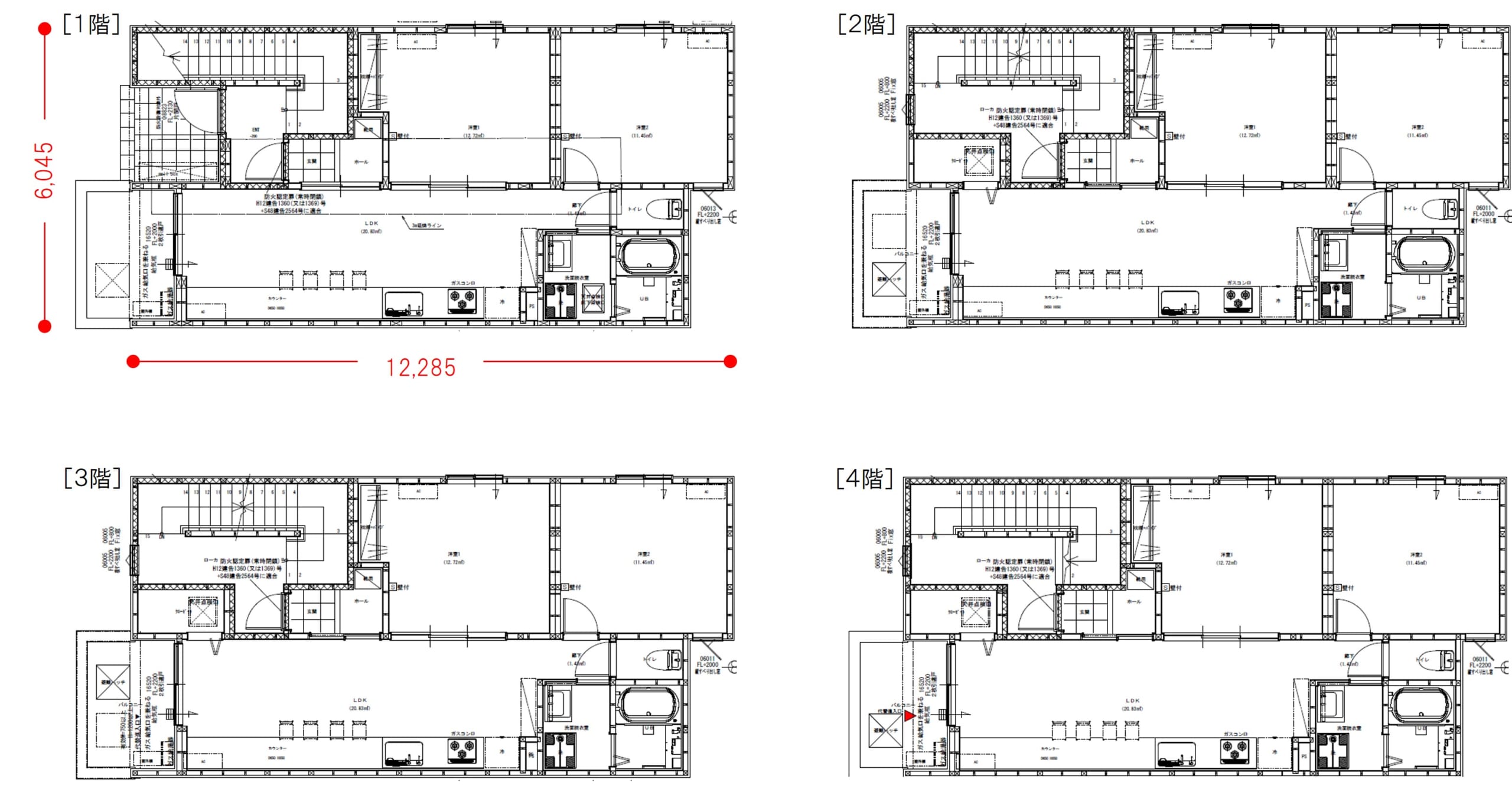 耐火建築物で石膏ボードの二重張りがありつつも室内や階段の幅員を確保する工夫が施されています。