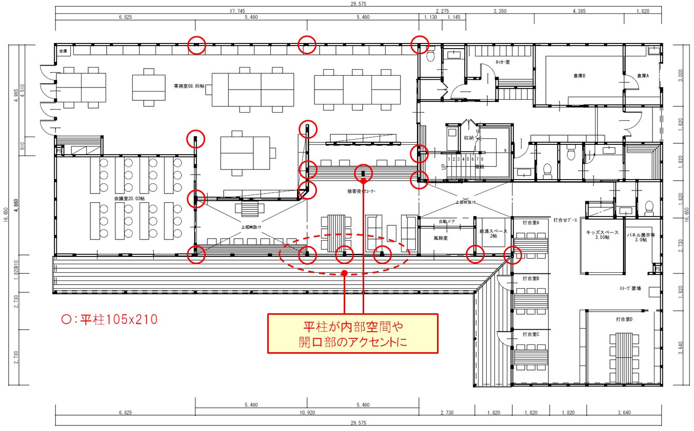 強度的に105角の柱では厳しい箇所については、平柱を意匠的に邪魔にならず、空間のアクセントにもなる様に