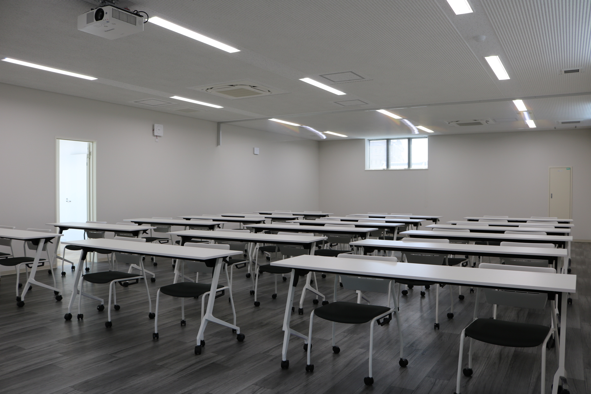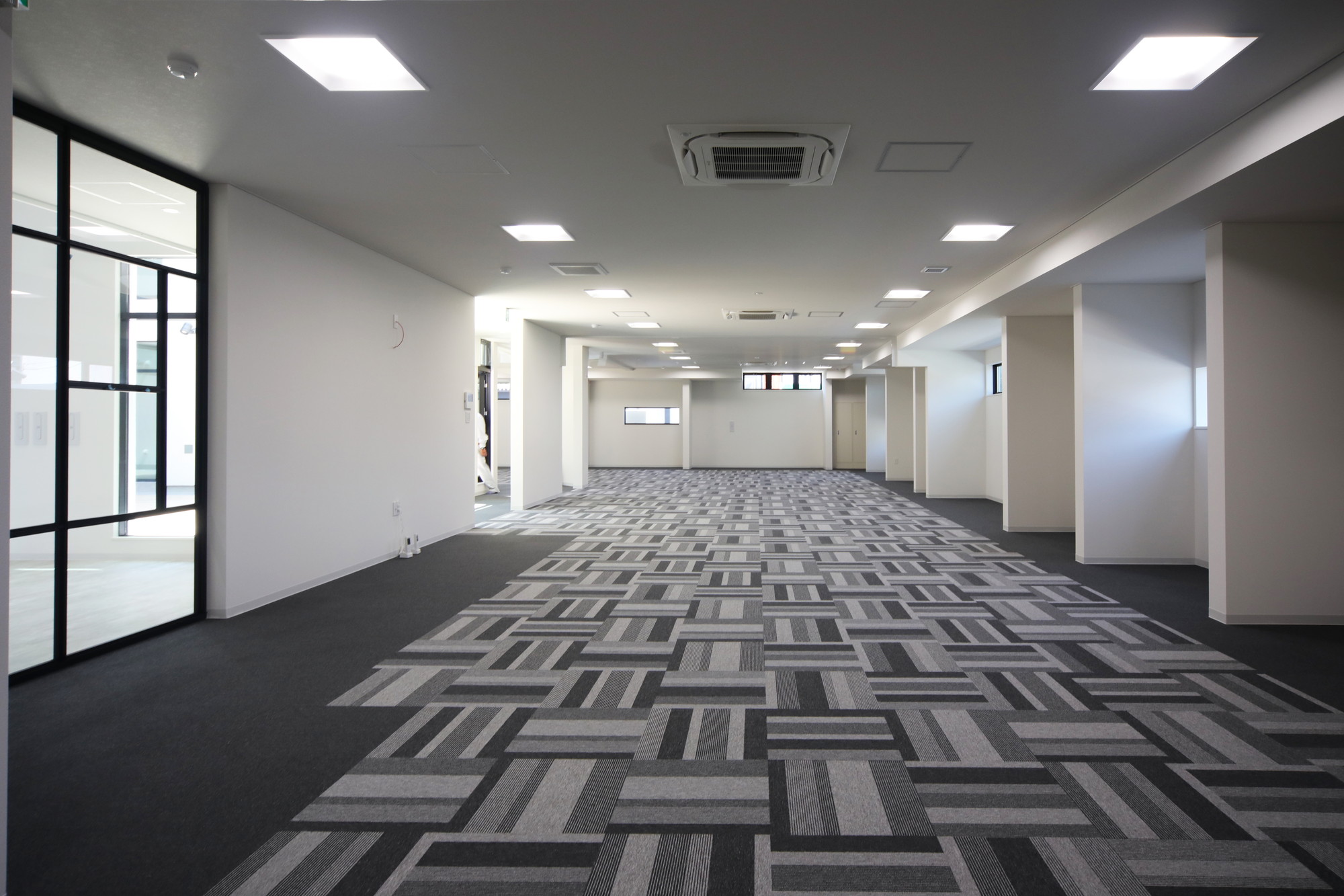2階_大会議室:2階は袖壁無しで、多雪地域でありながらもJWOODの強度を活かし、7.5mスパンで梁を架けています。