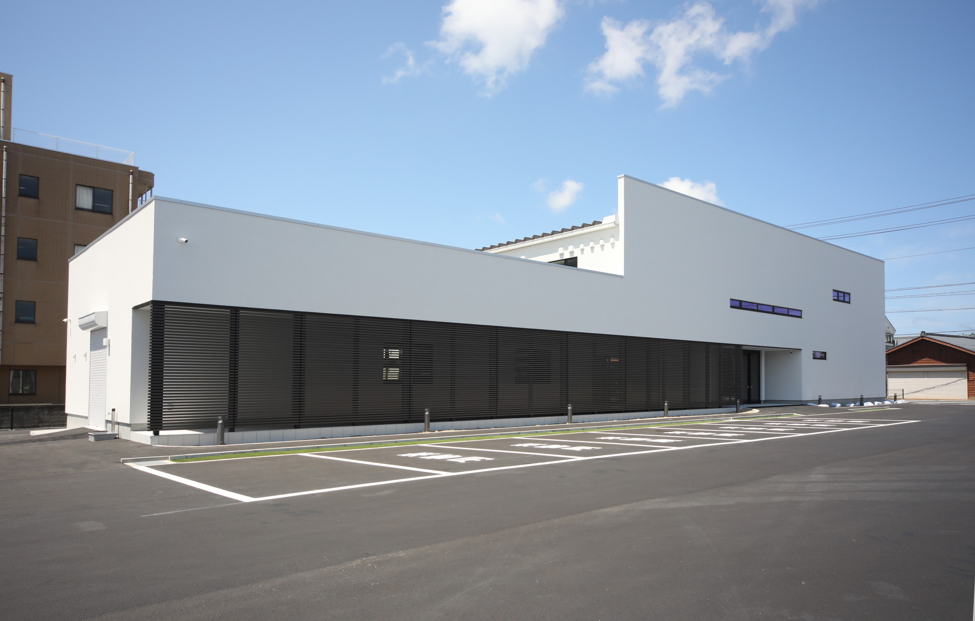 真っ白でシンプルな外観フォルムに、軒下空間のルーバー材と、バランス良くすっきりと配置された横長窓のアクセントが素敵な佇まいです。