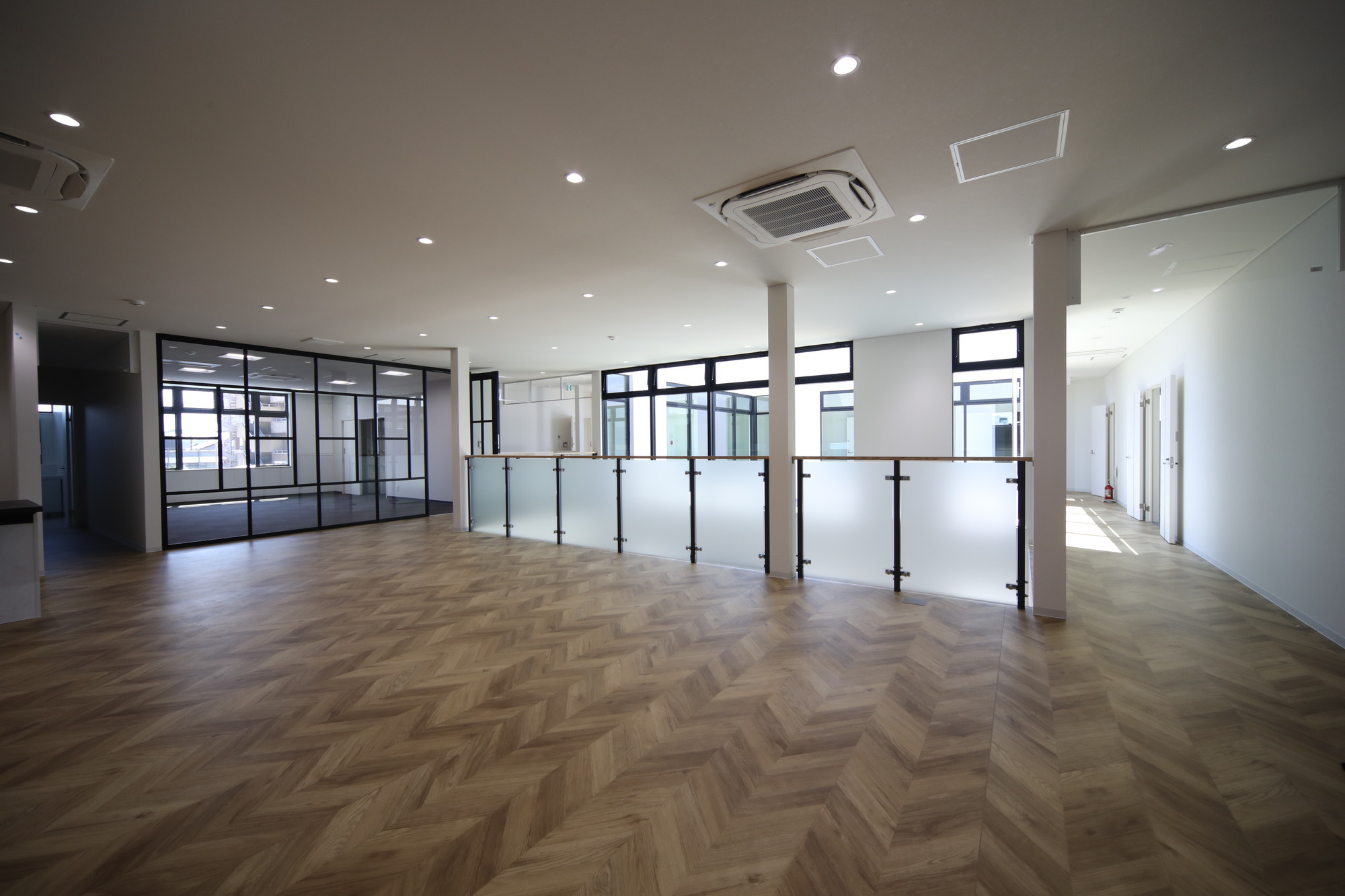1階の事務所は短辺方向7.5mの空間ですが、事務所のレイアウトを考慮しながら1mの袖壁を連続させることで、