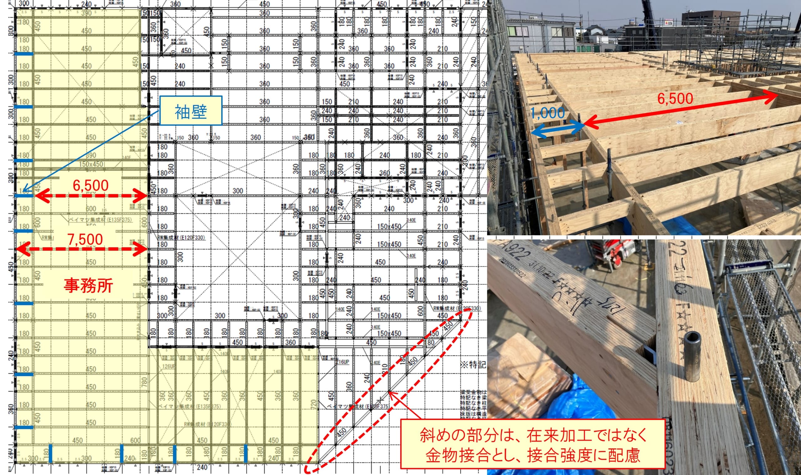 また、斜めの部分は、在来加工ではなく金物接合とし、接合強度に配慮しています。