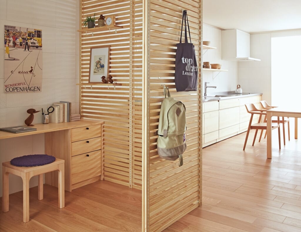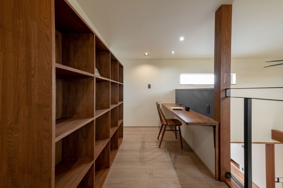 メリット:完全に孤立せず、家族の気配を感じながら作業ができます。壁で囲われていない分、視覚的な圧迫感が少なく、光や風も通りやすいため、限られた面積でも開放的なワークスペースが作れます。