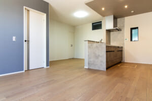 基本の色は白とグレー。そこに足されるアクセントカラーの青色。白い扉が映えるような青色が足され、空間にアクセントをもたらし...