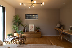 木とグレーを基調とし、少し落ち着いた室内にはたくさんの観葉植物を置くことで、どこかリゾート感を味わえる空間に。 リビン...