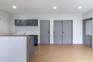部屋の全体にグレーを使ったお家。ドア、キッチン、床、階段、洗面台、、、 さまざまなグレーを集めてまとまりを作ったお家の...