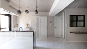 都会の感性が息づくこの住まいは、モノトーンで統一されています。 白を基調とし、石目調が施された光と影が織りなす空間は、...