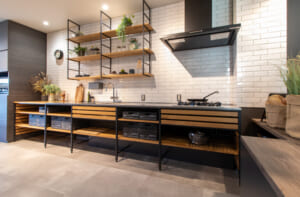フレームや棚板など最小限のパーツで構成される黒いフレームのキッチンが誕生しました。