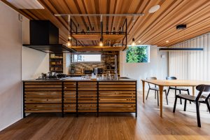 ステンレスと無垢の木と鉄の質感をあらわに、