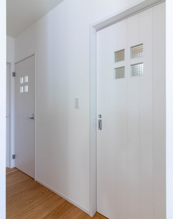 チェッカーアクリルの小窓が可愛いこの扉は、ドレタスのB-IFデザイン。 自室のプライベート空間を保ちながらも、光を取り込むことのできる優れものです。