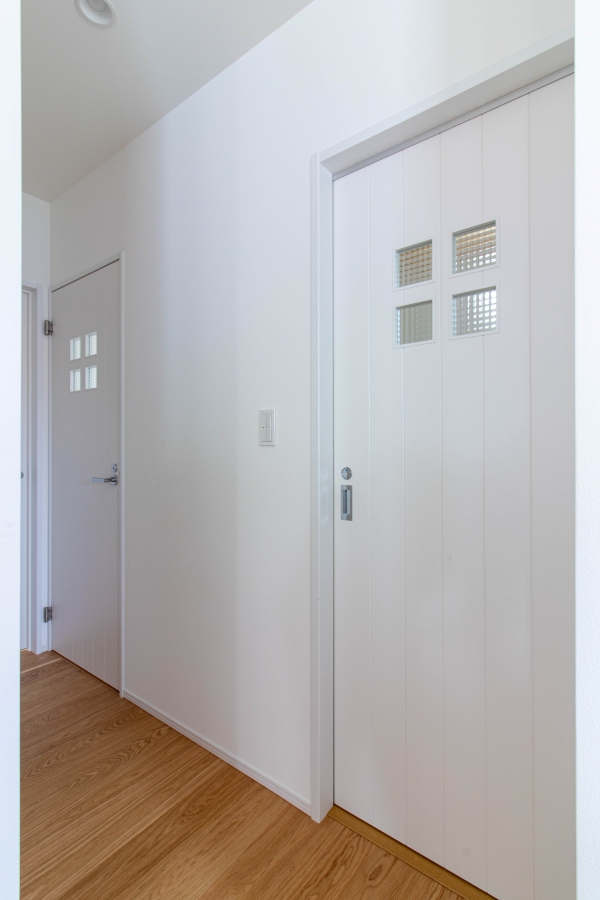 上質で美しいオークの床がより映えるようにと、扉は白を基調としています。 みた時の木目の表情の豊かさ、ふれた時の木のあたたかみ。 オークの存在感を、存分に堪能することができる空間です。