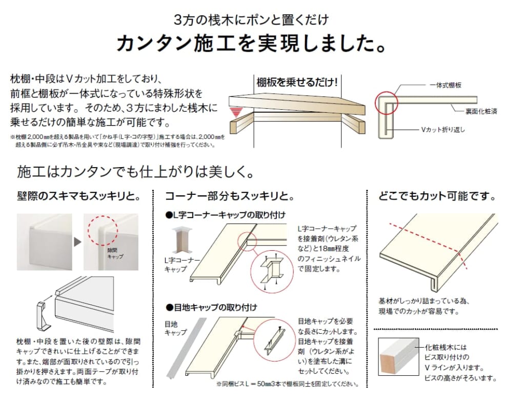 ジョイントパネルを使用することで、壁を作らず枕棚と仕上げてる棚板を併用することも可能!
