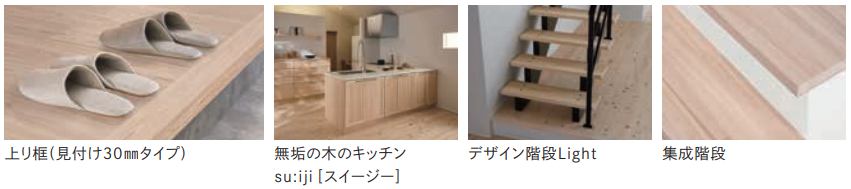 玄関框(見付け30㎜タイプ)やオープン階段などスタイリッシュなデザインから、定番のタイムレスなデザインまで幅広くコーディネートが可能です。