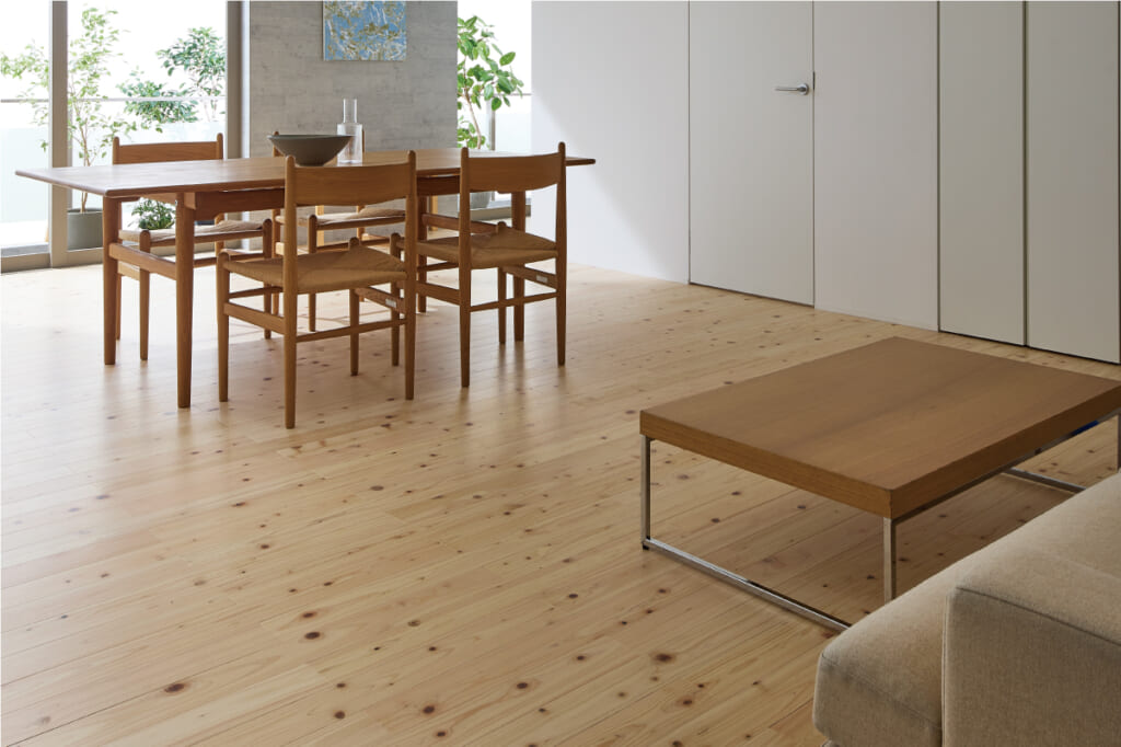桧の風合いが空間にすっとなじむ、国産材の無垢フローリングです。