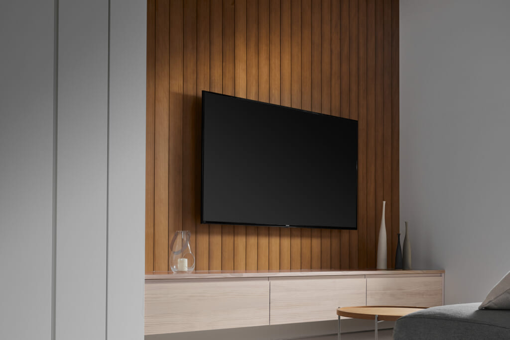 リビングの主役になる魅せる壁材。無垢材ならではの素材が持つ温かみと質感。空間のアクセントとなり、リビングの表情をより豊かにする。