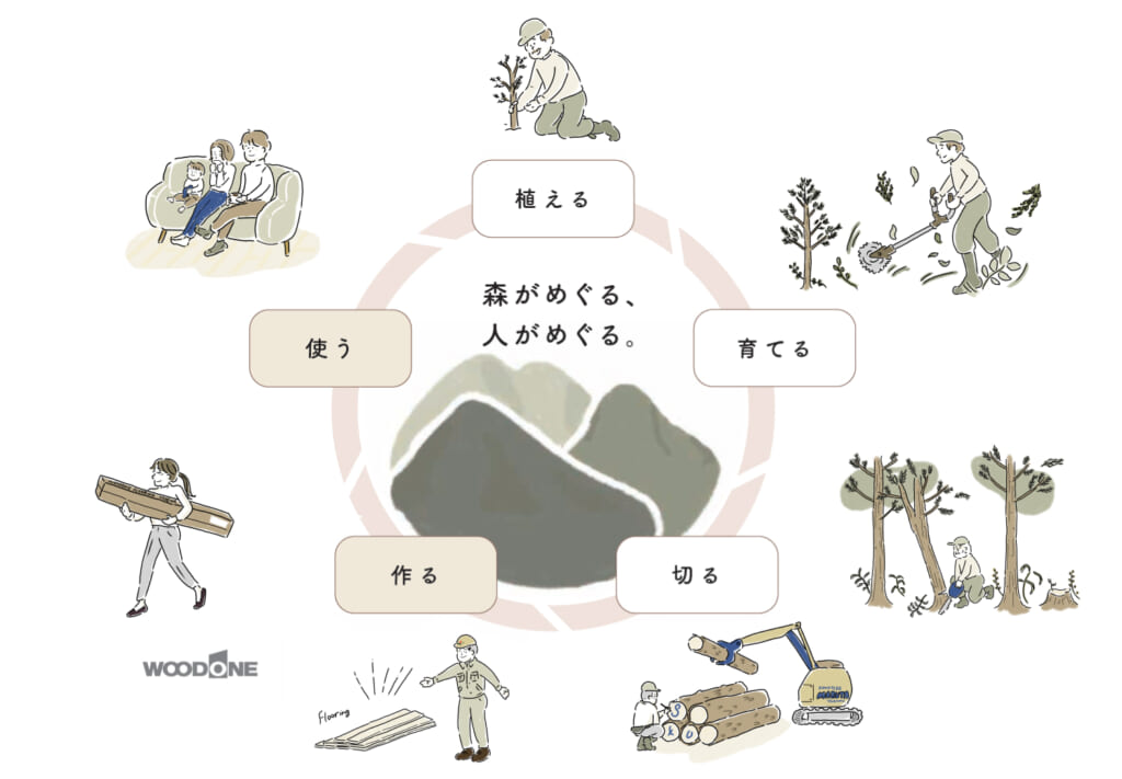 わたしたちウッドワンは、にほんで育った木を高付加価値商品として皆さまにお届けすることで、