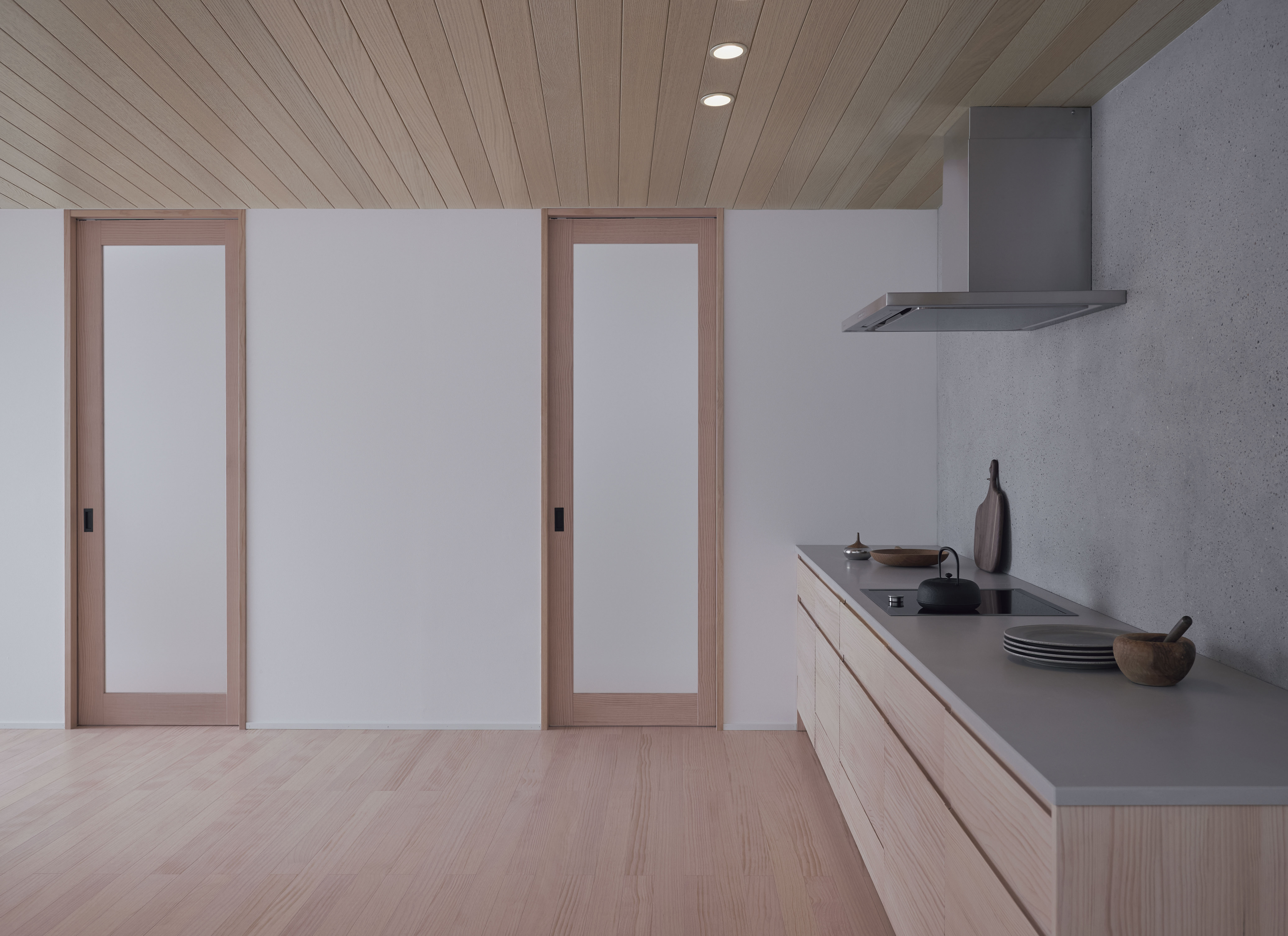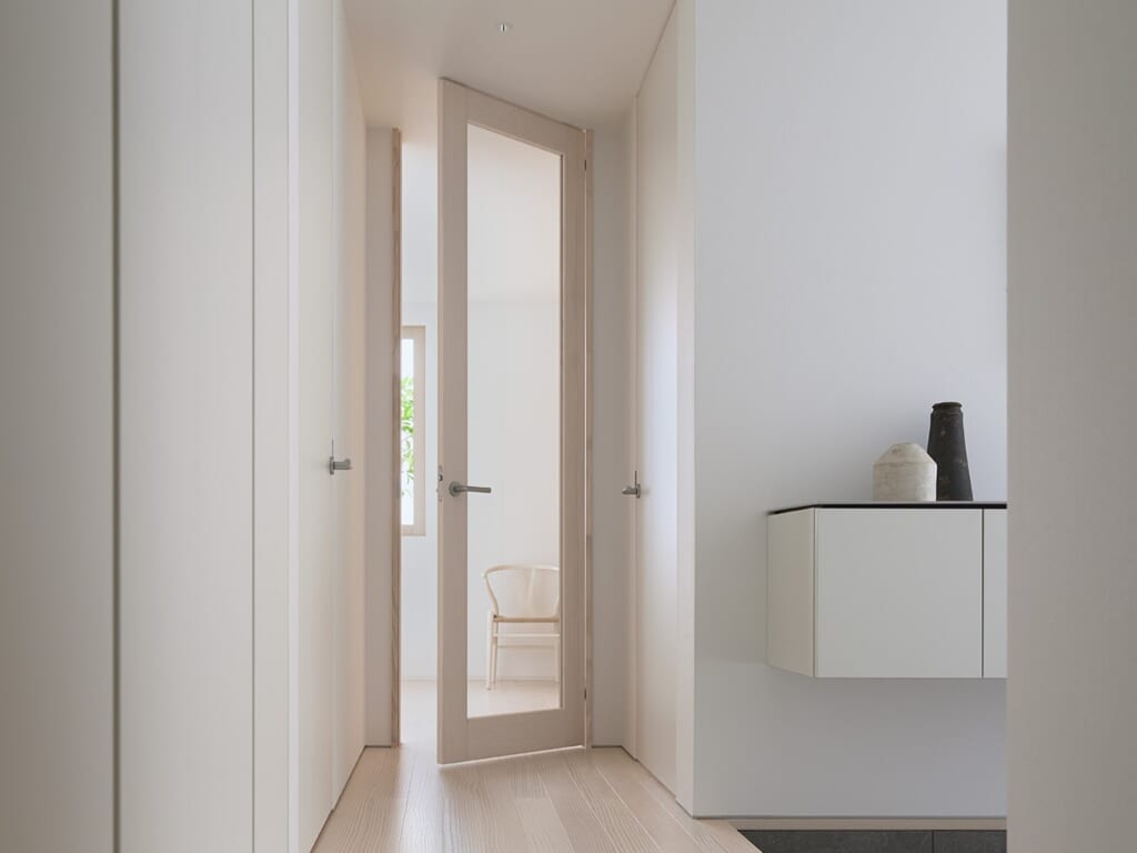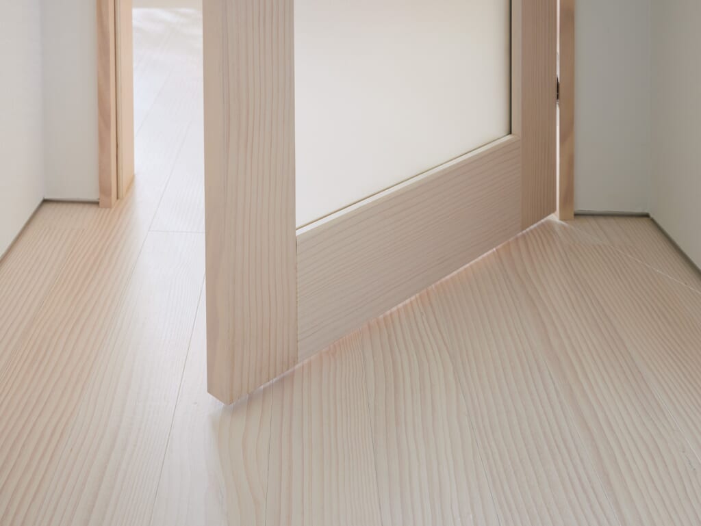 針葉樹であるニュージーパインの、直線的ですっきりとした木目は、シンプルでのびやかな空間をつくります。また、やわらかく澄んだ塗装が、節のない木目に馴染み、空間にやさしく溶け込みます。