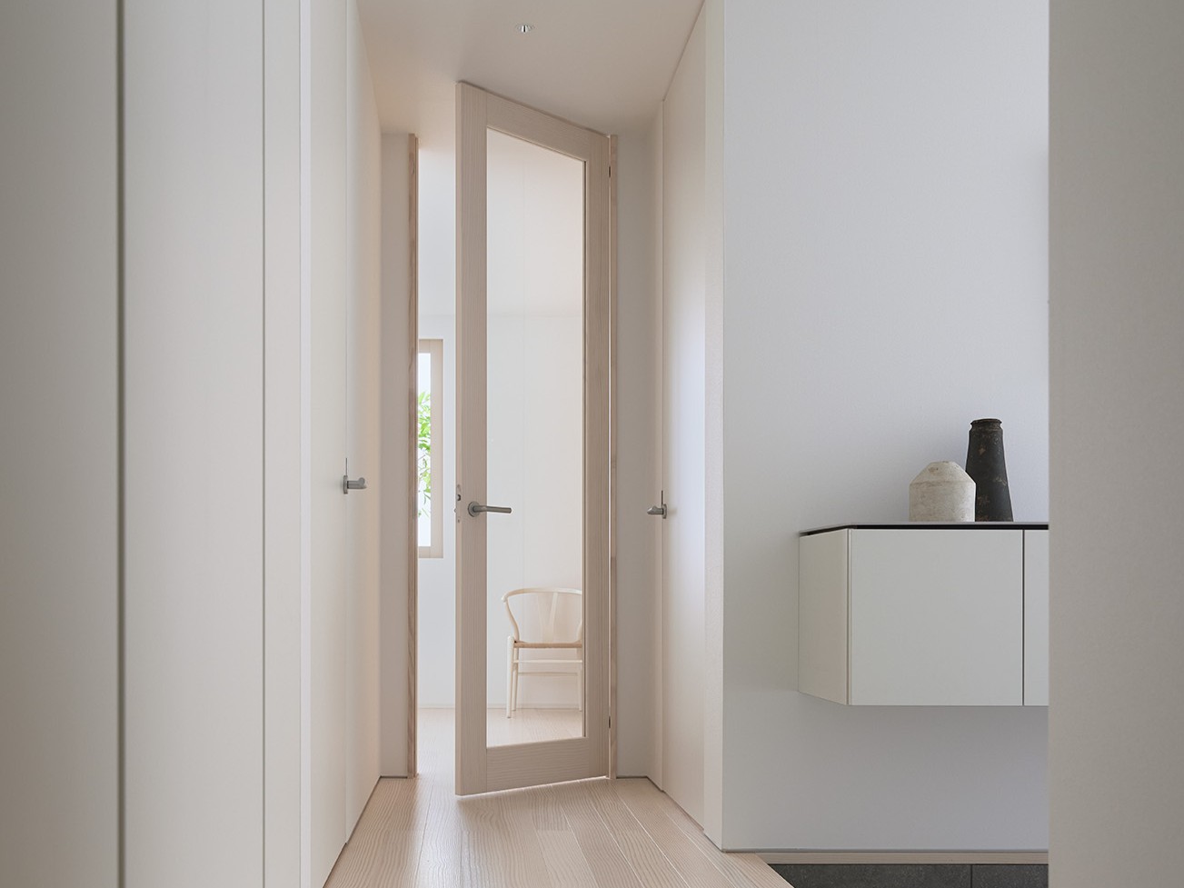 針葉樹であるニュージーパインの、直線的ですっきりとした木目は、シンプルでのびやかな空間をつくります。また、やわらかく澄んだ塗装が、節のない木目に馴染み、空間にやさしく溶け込みます。