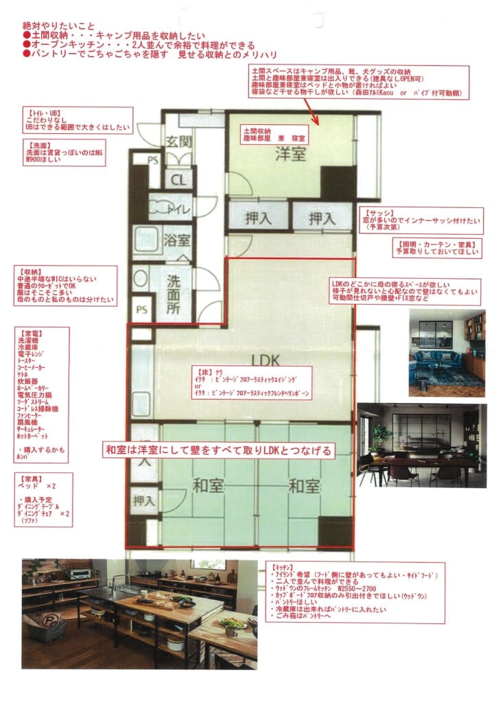 リノベーション前の間取りはLDKに隣接した和室2つに洋室1つという、細かく仕切られたいわゆる「昔ながら」のタイプ 。家づくりの際、お客様との打合せでも「絶対やりたいことを3つ掲げてください」と必ずお伝えしています。これがないと、選択肢の多い家づくりは軸がブレてしまうからです。 私自身が今回の自邸リノベで掲げたのは、この3つでした。