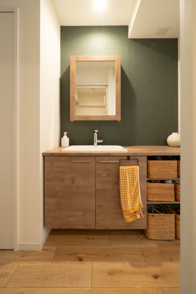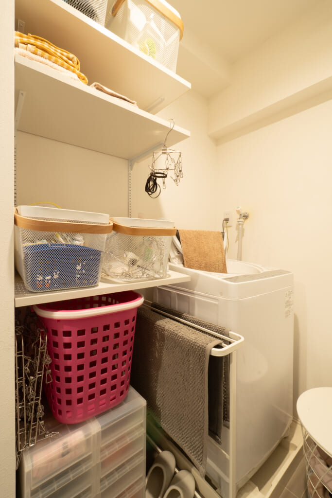 脱衣室には、メーカーの既製品ではなく、大工さんにサイズと枚数だけを指定してお任せで可動棚をつくってもらいました。洗剤やタオル類をかごにざっくりと分けてしまっています。あまり大きな声では言えないのですが、実は唯一の後悔ポイントがここの収納です。高い場所のものを取ろうと思ったときに、棚に少し体重をかけてしまったところ、レールが曲がってしまったんです…。棚板も木口が剥がれかけで…。耐荷重や製品仕様をしっかり確認しておくべきだったと感じています。もしやり替えることができるなら、ハンガーをかけることのできるパイプを付けても良いなと思っています。