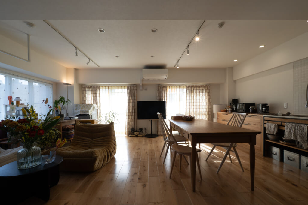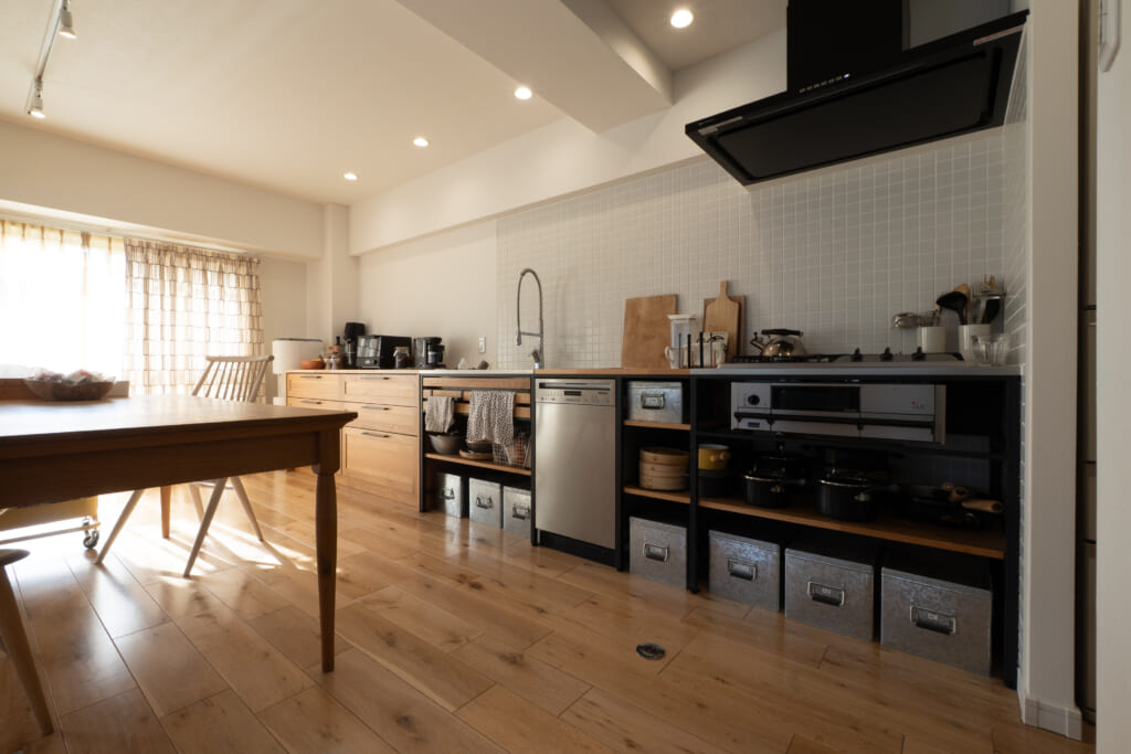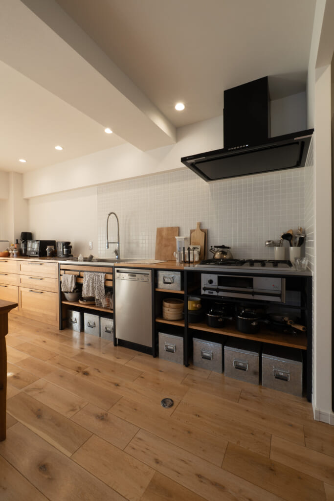 友人を呼んでパーティーをしたいなと思っていたので、LDKは広くとりました。約25帖ほどあります。LDKの顔となるキッチンはずっと憧れだったWOODONEさんのフレームキッチンとsu:ijiを組み合わせています。(こちらの収納についても、また詳しくは別でお話しします。)