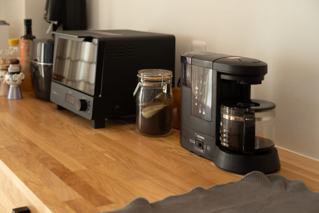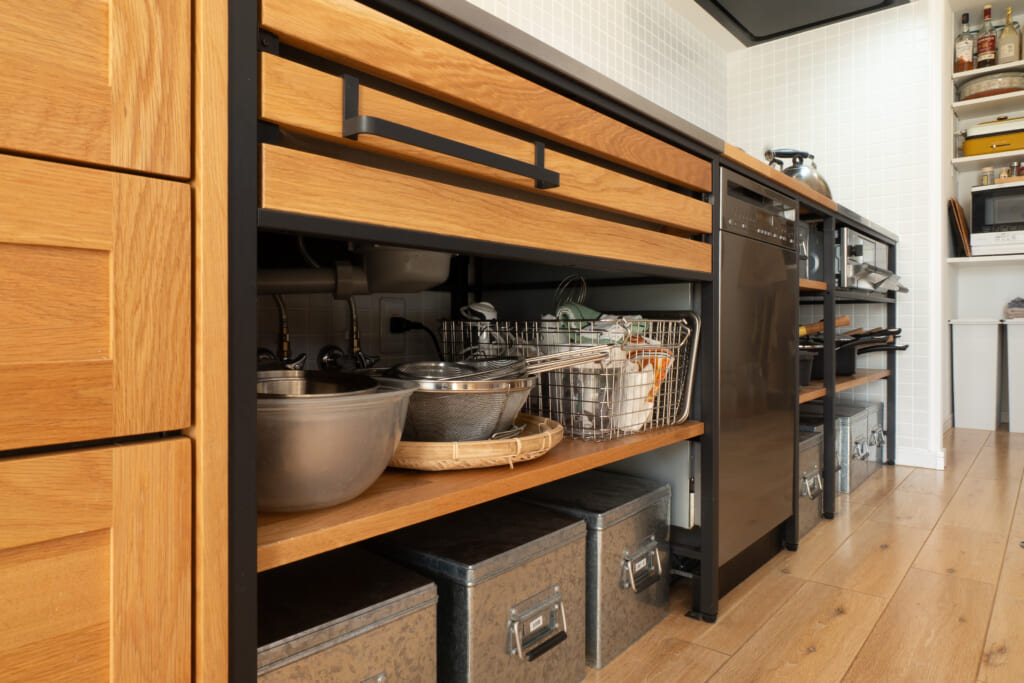 扉を開けるという動作がめんどくさいなぁと思っていた私にとって、このキッチンは扉が無いので、ぱっと物を取り出せて本当に使いやすいです。モノが丸見えのキッチンはどうしてもハードルが高く感じますが、フレームキッチンには”シルバー・黒・木しか置かない!”というゆるいマイルールを設けることで、キレイを維持しています。隣のsu:ijiの引出しの中は食器などをたっぷりと収納できる奥行きも魅力です。