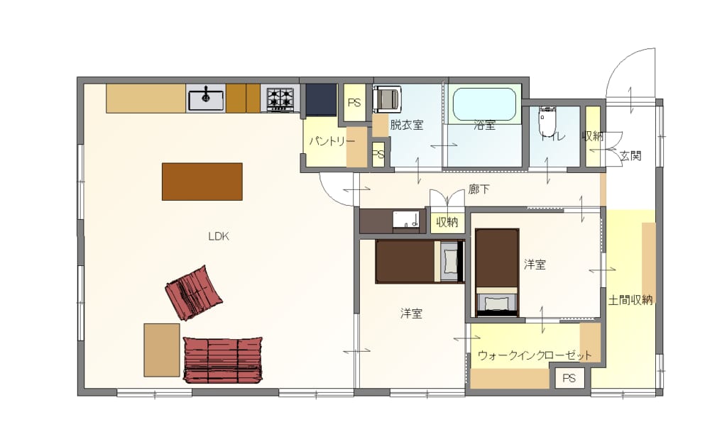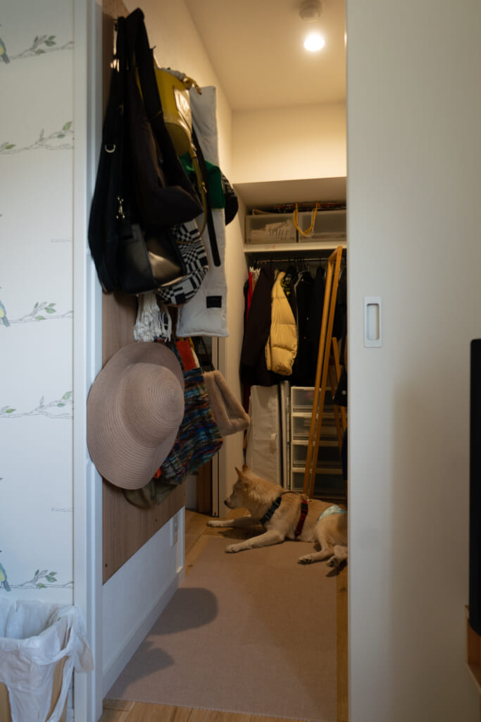 完成した間取りは、玄関から土間収納、すぐ隣に私の寝室兼ワークスペース、廊下に洗面があり、LDK、母の居室。そして、母の居室と私の寝室の間にウォークスルークローゼットを設けることで、ぐるぐる回遊できるスタイルに。今では愛犬が一番ここを走り回っています 。