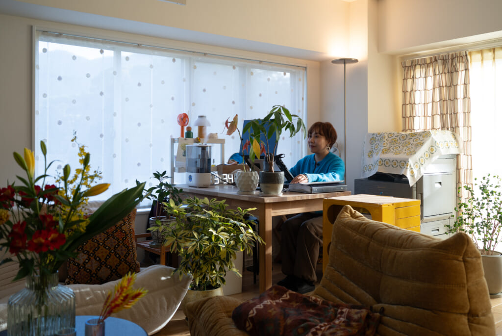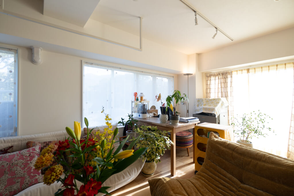 LDKは窓がたくさんあるので、光がたっぷりと差し込んでとっても気持ちが良いです。少し前に模様替えをして、LDKの一角にワークスペースをつくりました。私の寝室のワークスペースは長時間の作業だと、やっぱり狭くて気が滅入ってしまって…。ここなら愛犬や母の様子も伺いながら気持ち良い自然光の中で仕事ができてとっても快適です。