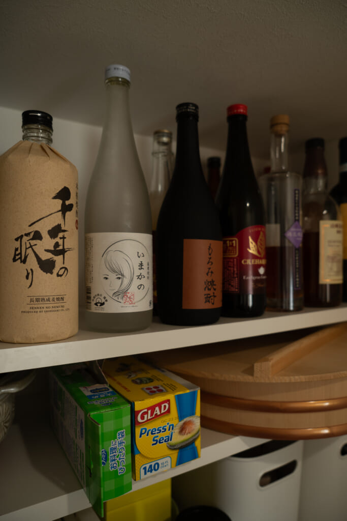 キッチンの横には小さなパントリーを設けています。冷蔵庫と、奥行400mmの固定棚が1枚、奥行350mmの可動棚が3枚あります。ゴミ箱、段ボールストック、電子レンジ、トースター、寿司桶、それにお酒がたくさん!あ、お酒好きなのバレましたね。笑