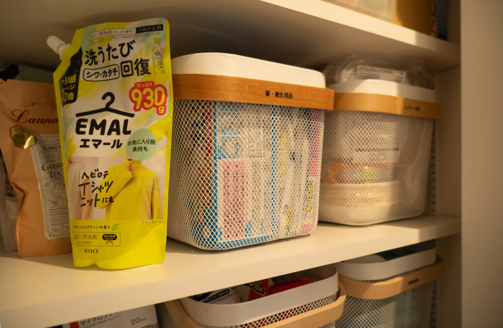 しっかりとゾーン分けというより、自分の動きに合わせてところどころに必要なものを置いています。極力動かないようにって常に思ってます。めんどくさがりやなんです。よく、同じ箱に入れて、びちーっとキレイにしまっている人もいると思うんですが、私はかごに入れてるものもあれば、直接棚に置いているものもある。自分のなかで、使いやすく、しまいやすいように、緩く分けています。