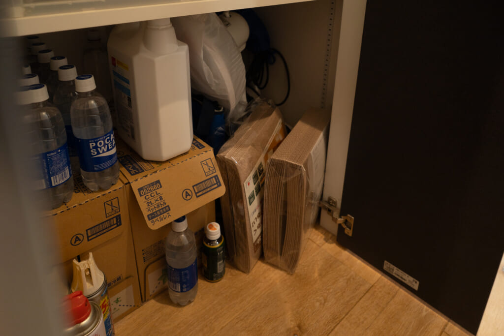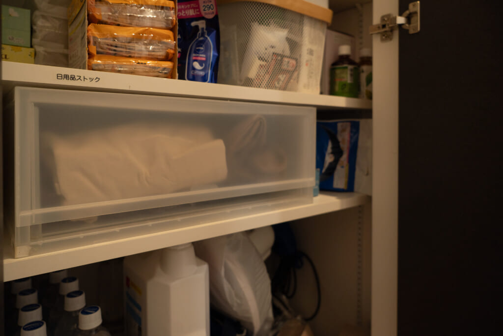廊下に洗面台を設置し、その隣にクローゼットを設けています。このクローゼットにはいろいろな物をしまってますね。日用品、備蓄品、水、ティッシュ、マスク…。あとパジャマもあります。何でここに?って思いますよね。クローゼットの正面に脱衣室があるんですけど、パジャマは脱衣室から出てすぐとりたくて。