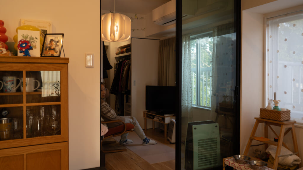 LDKと隣接して母の居室があります。仕切りはガラスの扉にしてゆるく仕切っています。高齢で心配ということもあり、お互いの気配をさりげなく感じつつ、必要な時にはすぐ様子を確認できるようにしました。そして、母の居室を抜けた先に、私の寝室ともつながるウォークスルークローゼットがあります。私の寝室からも、母の居室からもアクセスできるようにしました。生活リズムが違うので、お互い干渉せずに使えて良かったです。