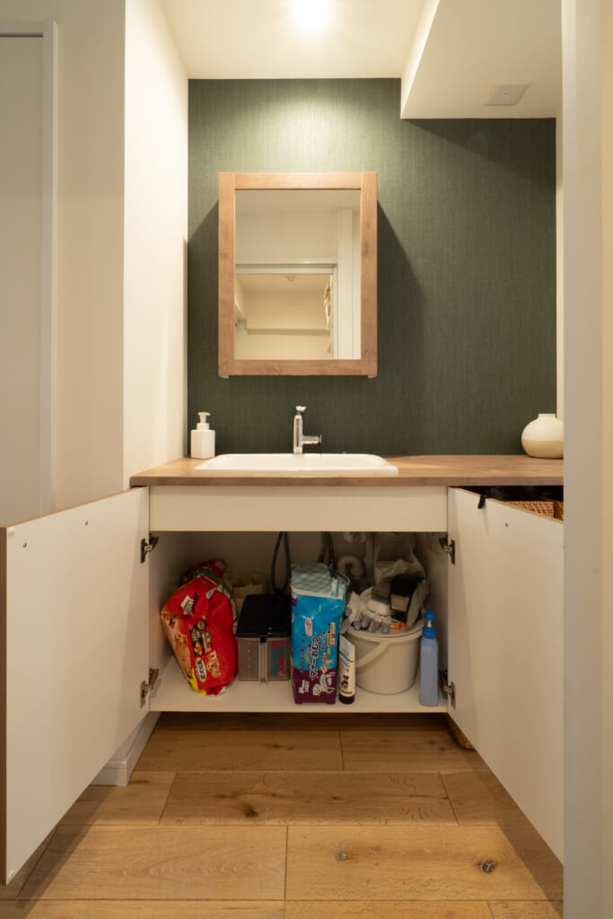 洗面台の下の収納には犬のグッズやお掃除用具を入れています。開き扉にしたので高さのあるものを入れることが出来て良かったです。犬のグッズは、入居当初、土間にしまっていましたが、使いやすいこの場所に変更しました。まだまだ余白もありますね。サイドの棚にはカゴを並べて、化粧品やドライヤーをしまっています。