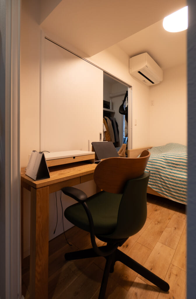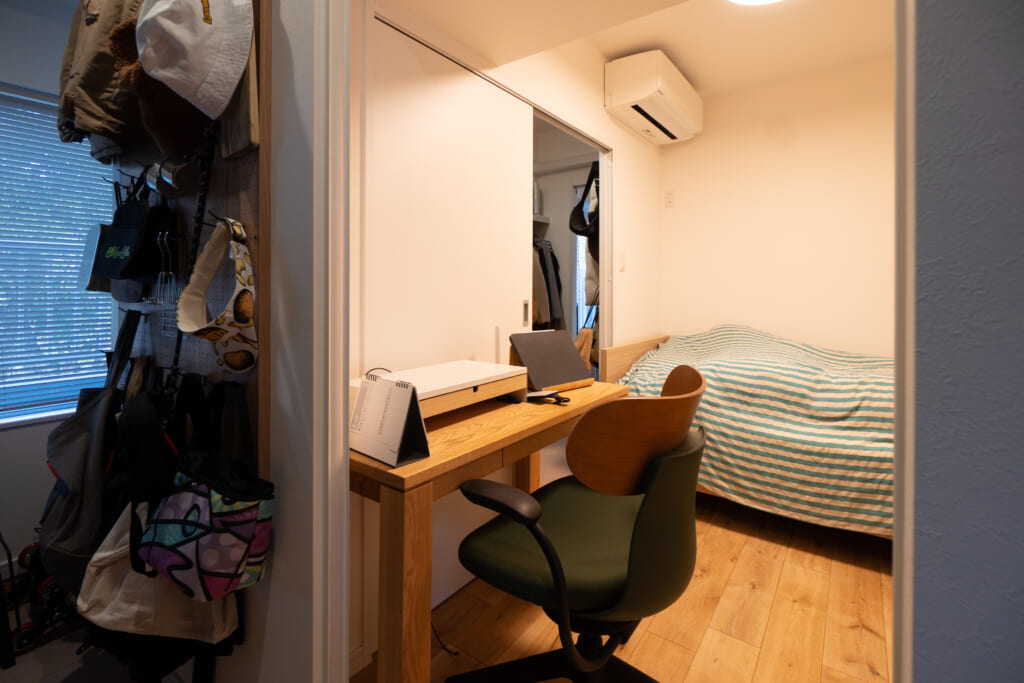 土間収納の隣には、私の寝室兼小さなワークスペースがあります。この部屋は小さく窓がないため、ガラスの引き戸にすることで、土間の窓からの光を取り込めるようにしました。