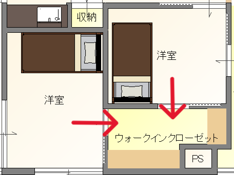 2つの部屋からアクセスできるウォークスルークローゼット