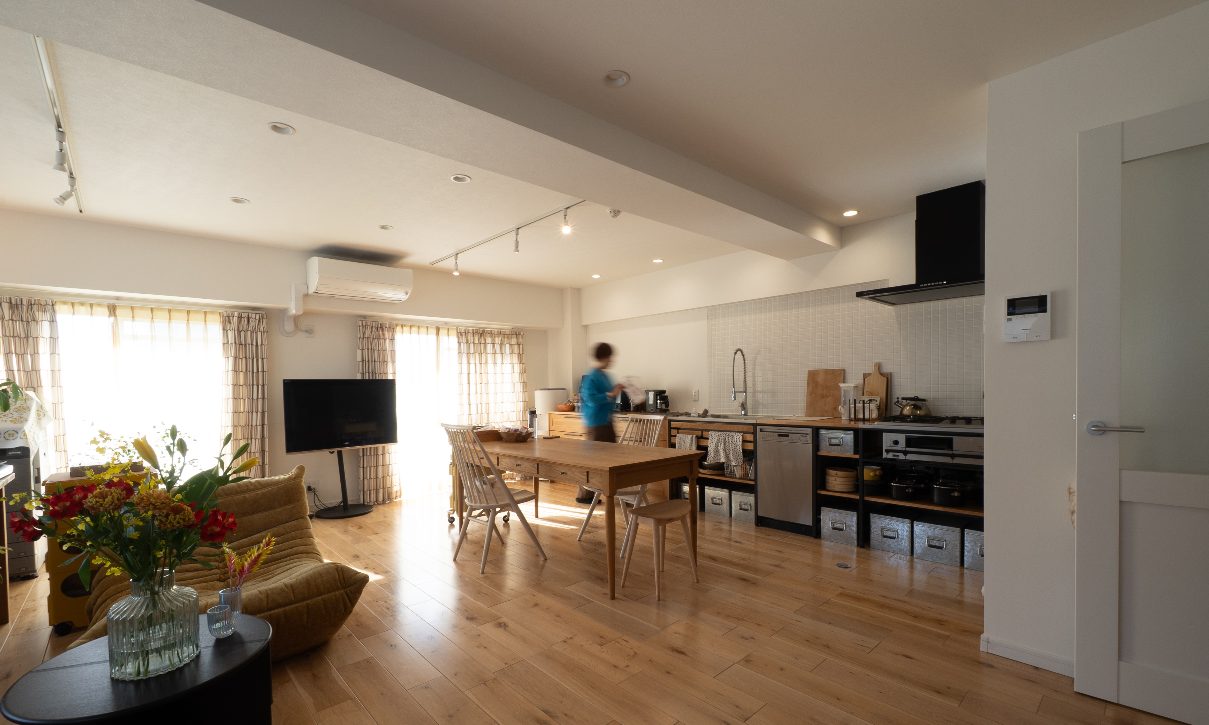 友人を呼んでパーティーをしたいなと思っていたので、LDKは広くとりました。約25帖ほどあります。LDKの顔となるキッチンはずっと憧れだったWOODONEさんのフレームキッチンとsu:ijiを組み合わせています。(こちらの収納についても、また詳しくは別でお話しします。)