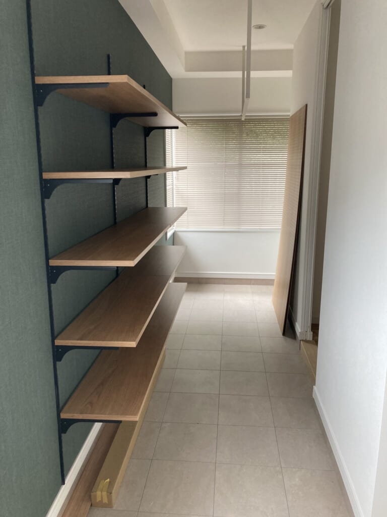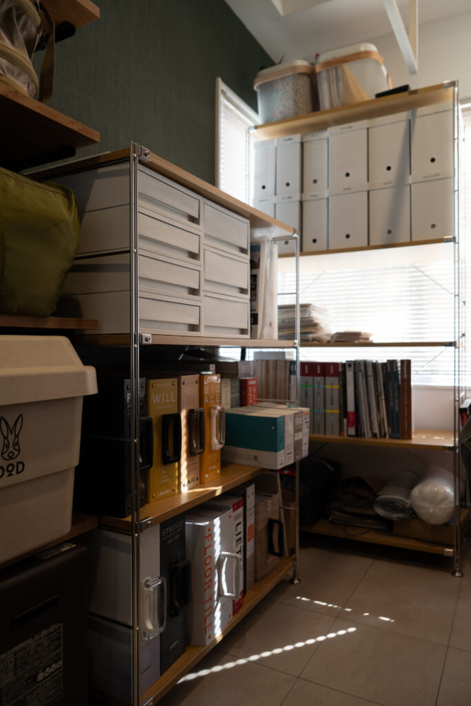 今ではその余白の部分に市販のラックを使って、仕事で使うサンプルなどをたっぷり置いています。リノベーション当時はこんなに早く独立して仕事をすると思っていなかったので、想定外でしたが、余白を設けておいて良かったなぁと感じています。