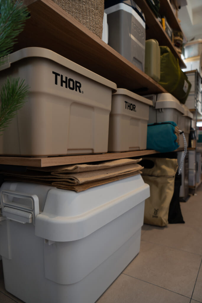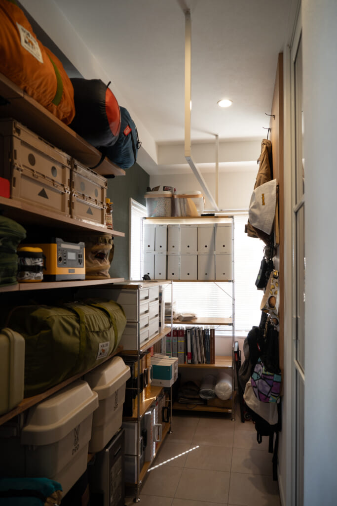 一番下には備蓄品をしまった収納ケースを置いています。中身は災害時の防災用品や保存米などです。棚の奥行きは450mmと悩んだのですが、深すぎると奥のものが取り出しにくくなるかなと思い300mmにしました。結果的に収納ケースやテントもぴったりおさまって満足しています。棚は可動もできるので、今後収納物が変わっても高さを自由に変えることができます。