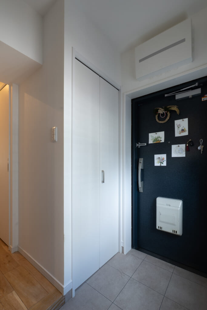 靴は玄関入ってすぐ右横に靴箱を設けています。リノベーション前は奥行きが深かったのですが、裏にあるトイレを広げて、ここは靴専用の奥行きにしました。靴のほかにはエコバッグもしまっていますね。「好きなキャンプ道具は出して収納、靴は扉の中にしまって収納」と分けています。この緩いルールが快適で使いやすい収納だと思っています。