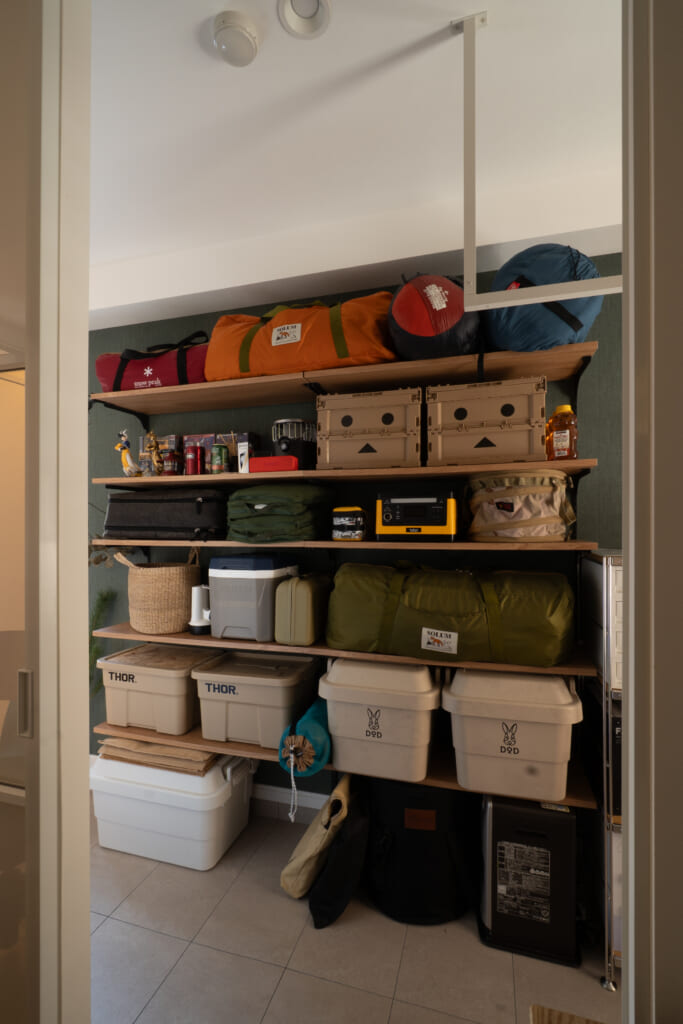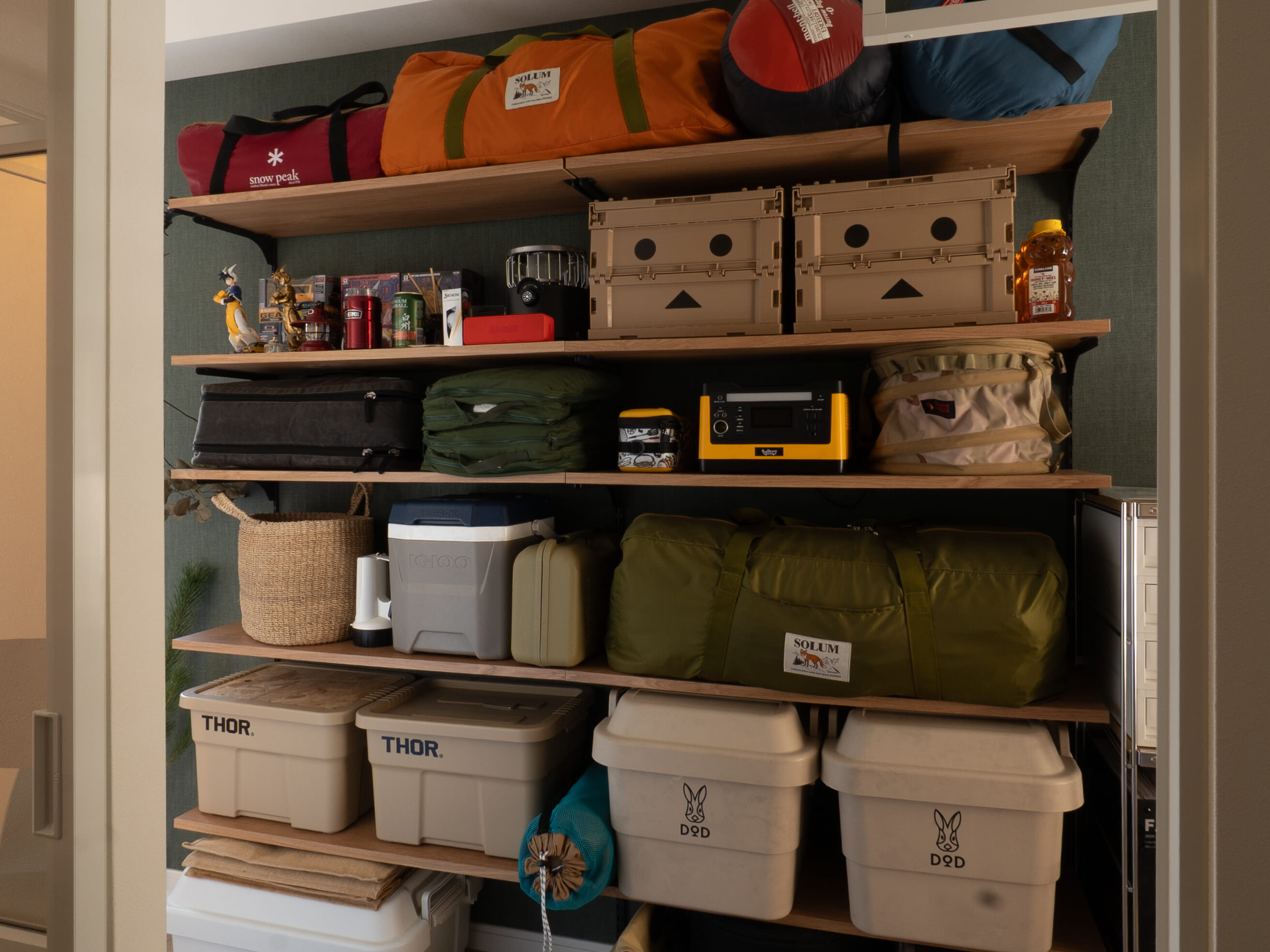 重いキャンプ道具も安心の強度。「仕上げてる棚板」でつくった土間収納の活用術と、収納に"余白"を残すメリット。