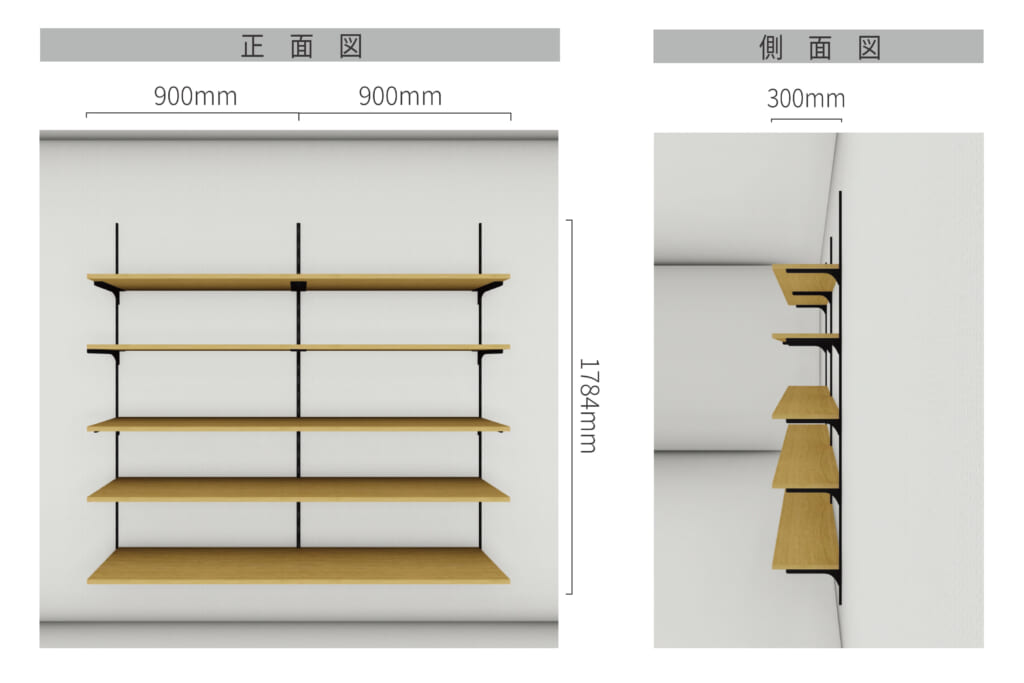 間口900mm、奥行300mmの棚を2列×5段並べています。キャンプ道具は量も多く、テントなどはとても重たいのですが(18kgほど)、たっぷり収納できました。強度もしっかりあったのでびっくりしました。(私のインスタグラムの投稿に耐荷重の確認方法も投稿しています!)また、棚板の表面は汚れにつ用シートが貼られているので、汚れてもすぐにサッと拭き取れます。