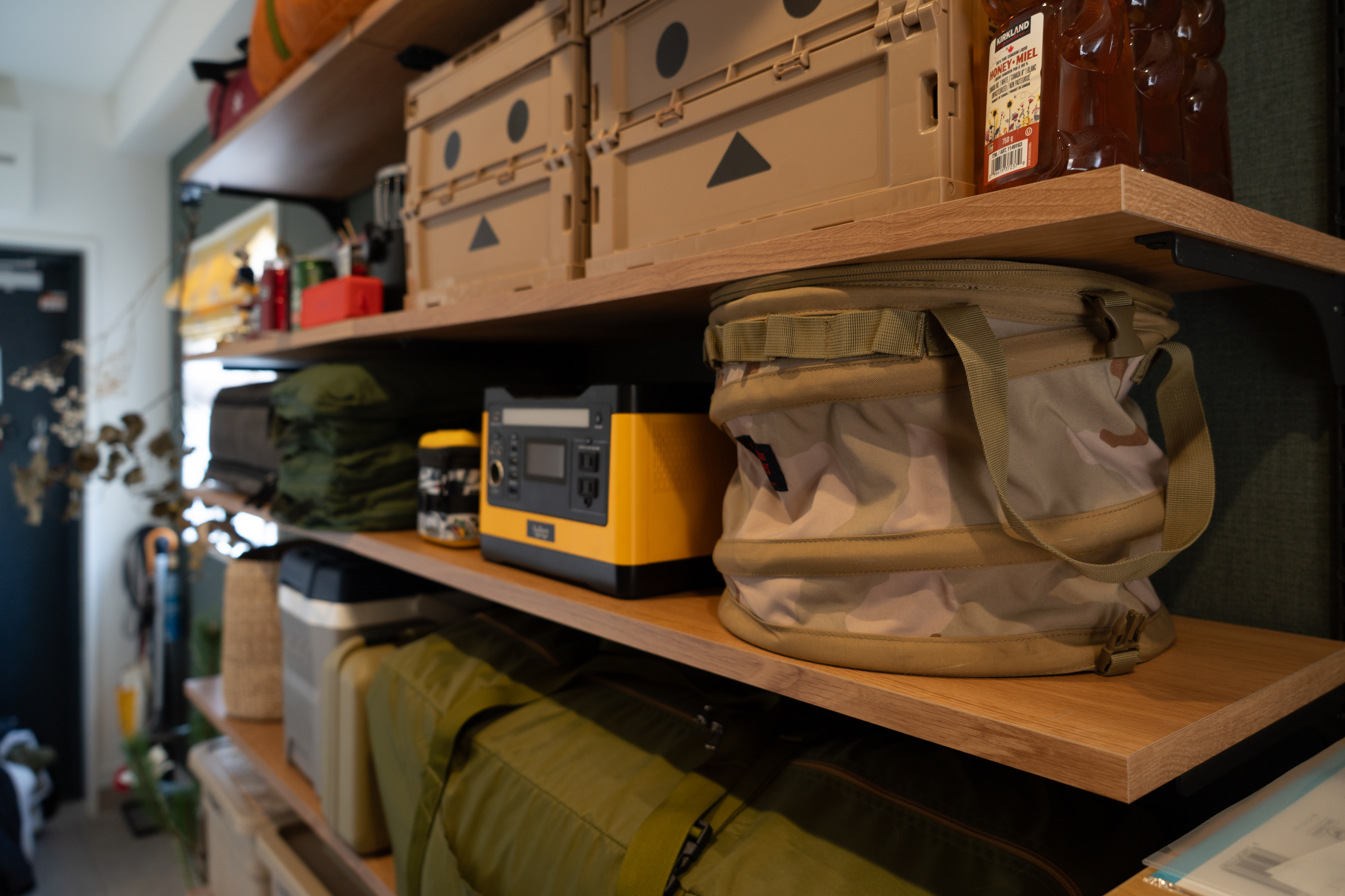 重いキャンプ道具も安心の強度。「仕上げてる棚板」でつくった土間収納の活用術と、収納に"余白"を残すメリット。