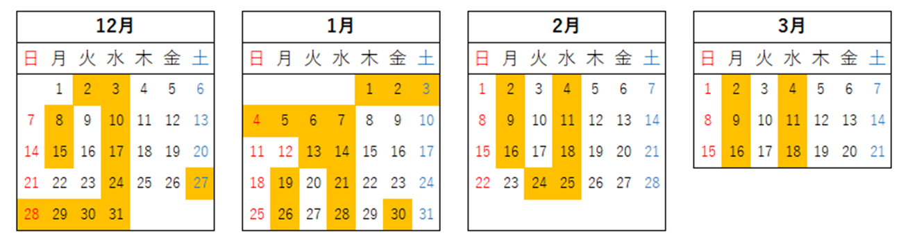 2025年12月8日(月)~2026年3月18日(水)の期間、営業日が以下の通りに変更となります。