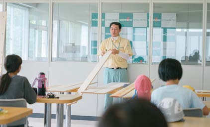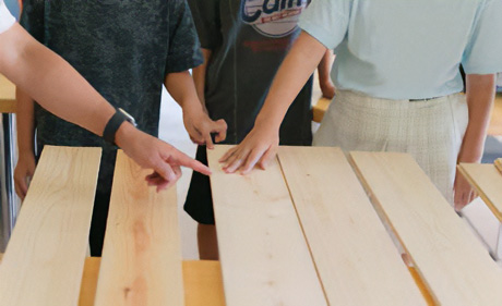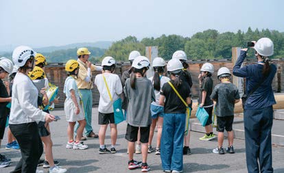 2025年7月には株式会社FOREST WORKERの主催で、庄原市の小学校から16名の児童を迎え、原木の土場や製材ラインを見学してもらいました(写真はその時の様子)。