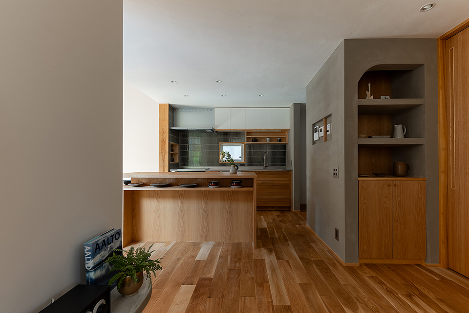 家族がもっとも長く過ごすキッチン・ダイニングを、暮らしの中心として豊かに彩ること。そこには、「時間を有意義で心地よいものにしたい」「日本の色彩を暮らしに取り入れたい」という住まい手の強い想いがありました。ダイニングは朝から昼にかけての食事の時間帯に自然光が心地よく降り注ぐ南東方向に配置。プライバシーを守りつつ開放感を得られるよう、中庭を設けることで、内と外の空間がやわらかに繋がります。キッチンは、LDKの中心にレイアウト。無垢の木のキッチンは、空間全体に用いた自然素材と調和し、家族の活動の核として機能します。壁面には日本の伝統的な色彩をイメージしたタイルを施し、落ち着きの中に彩りと表情を添えました。空間の一角には小さな小上がりの畳スペースを設け、くつろぎや来客対応など、シーンに応じて柔軟に使える居場所を確保。家族の営みが自然に交わり、時間の積み重ねが豊かな記憶となる、そんな空間を目指した。