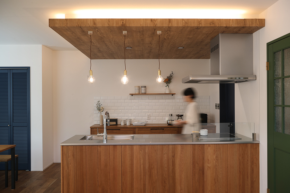 鮮やかなグリーンが目を引くK様邸。 ご夫婦の好きな色・好きなテイストをふんだんに取り入れたヴィンテージスタイルのお家です。玄関を入ると目に飛び込んでくるのが鮮やかな色の建具。リビングの扉はグリーン、洗面の扉はイエロー、キッチンの扉は深いブルーと色を使分けながらもらバランスよく空間に溶け込んでいます。リビングの床材は濃い色合いに仕上げたオークを採用し、ヴィンテージの雰囲気を一層引き立てています。 キッチンとカップボードはウッドワンで統一。 キッチンの下がり天井とリビングの一部に配した間接照明がムーディーな雰囲気を醸し出します。デザインだけでなく、家事効率の良い間取りもポイント。 広々とした洗面は勝手口とつながり、そこで洗濯物を干すことができます。 ファミリークロークが1階にあるので乾いた洗濯物をすぐにしまえる、スムーズな動線を叶えました。