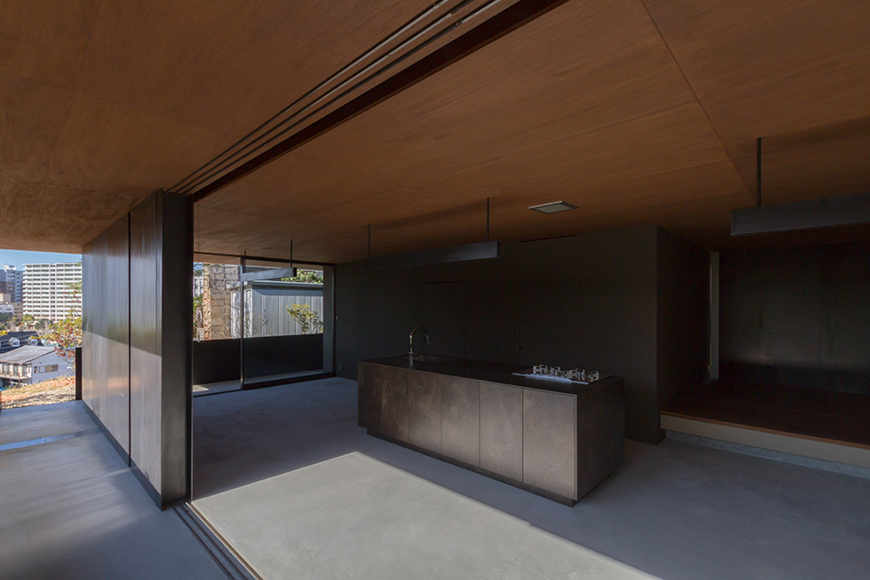 【盾の家】 「鉄の壁を重ねて居場所をつくる」 武士の町である、福岡城近郊のエリアにちなんで、 高台の土地に盾を立てて構えるように、 複数枚の鉄の壁を配置し、居住空間をつくることを目指した。 「隠すことで引き立てる」 人は見える部分から見えない部分を想像するため、鉄の壁は、景色を“全部”見せるのではなく、“一番良いところ”だけを切り取って見せるように配置している。 「暮らしに余白を残す」 施主様のライフスタイルの変化に合わせて、自由に住まい方を変化させられるように、家の内部はあえて作り込ま無いようにした。