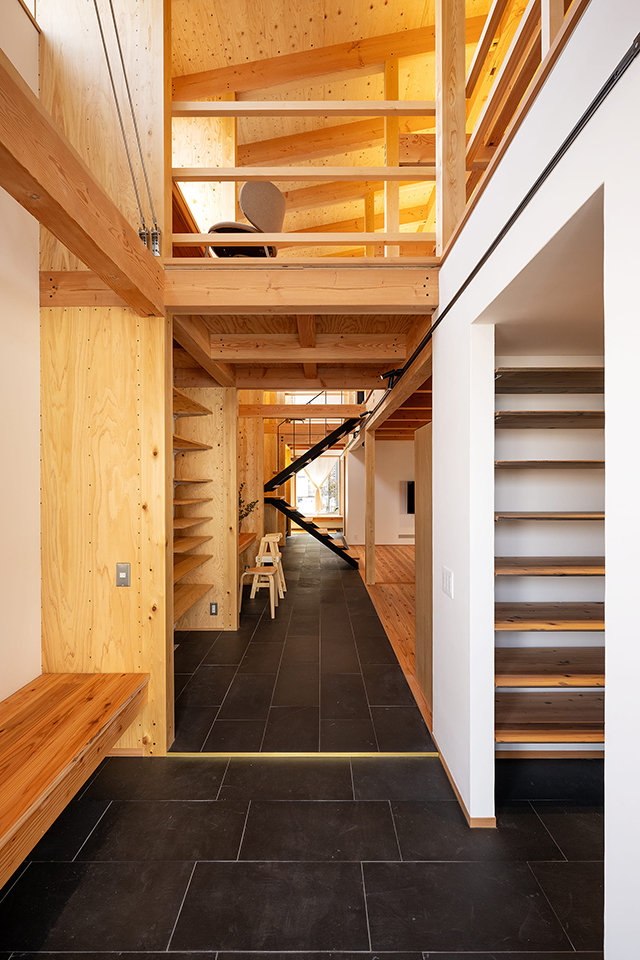 中心市街地から郊外へと向かう国道が、川を渡る手前の交差点に島のように残された街区に建つ住居。 交通量の多い国道と居住空間の緩衝帯として、住居の内部に「通り」を作ることにした。 「通り」は幅1.4m、長さ7間、2層吹抜けの石敷きで、国道に対し1階は閉塞し、2階は開口としている。 居住空間で感じる車の速さ・音をできるだけ消し光だけを取りこんでいる。 東西の両壁面は1間ピッチの耐力壁のリブとし、リブの間を各空間に応じたユニットとした。 棚や洗面の他にベンチ、カウンターも組込み、「通り」にはみ出せる居場所をあちこちに作った。 内部は手洗い以外は収納にも建具が無い大きなワンルーム。 今は6人家族の住居であるが時が移ろえば人員も入れ替わる。 住居ではないものになるかもしれない。 メンバーや用途が変わったとしても人の暮らし・営みを支えることのできる、融通無碍な器としての建築を目指した。