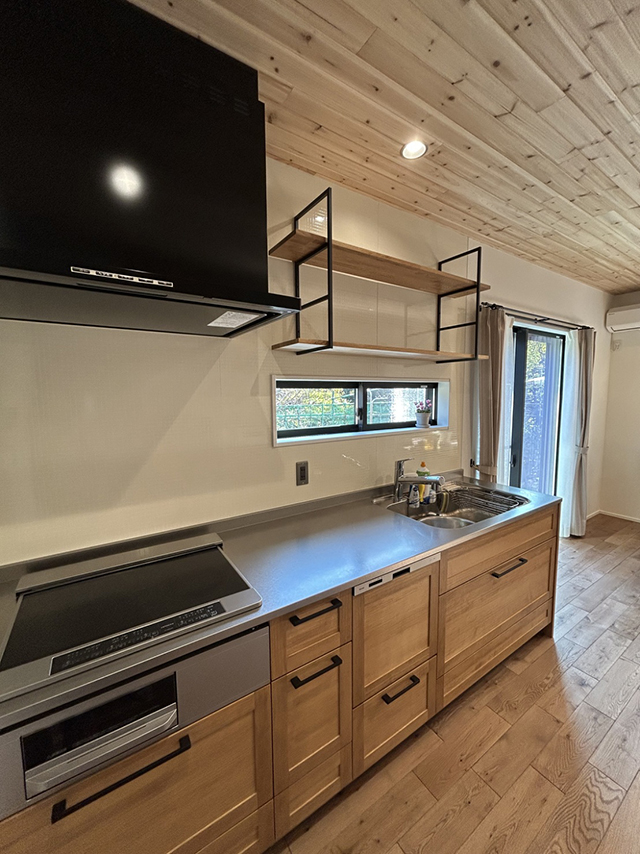 築40年、底冷えがつらかった軽量鉄骨のおうちを一部木造で増築し、一階を全面リノベーションしました。 床や天井はもちろん、キッチンにも無垢の木のキッチン【スイージー】を採用。壁にはウッドチップクロスを貼り、天然粘土塗料で仕上げました。 新しくなったおうちに一歩踏み入れば、木のぬくもりと自然素材が織りなす清涼感あふれる空気につつまれます。 見た目の変化はもちろん、開口部と断熱材を全面的に入れ替えたことで、躯体の断熱性能もグンとパワーアップし、夏涼しく冬暖かいおうちに大変身しました。 玄関ホールには、施主様の憧れだったアーチ開口のシューズクロークをつくり、コートなどを掛けられる小部屋と回遊できるようになっているのもポイントです。
